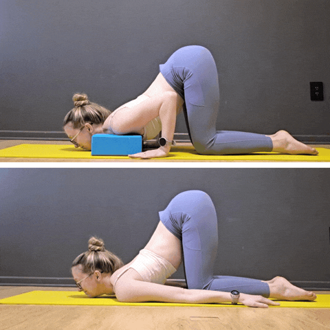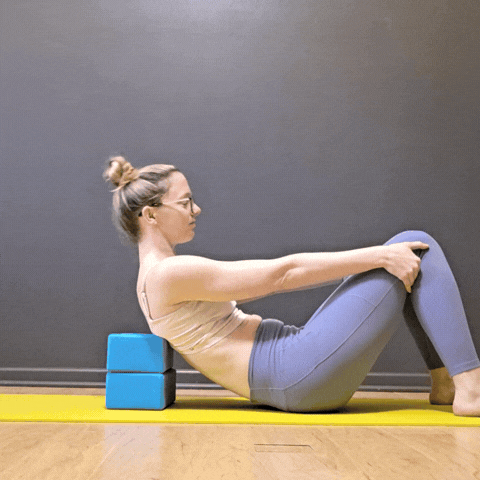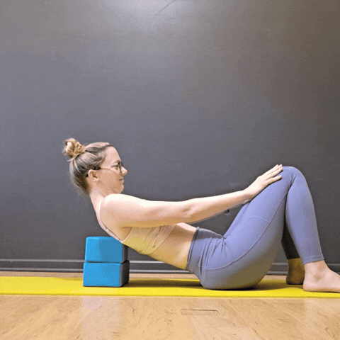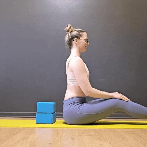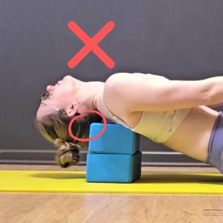 Make it easier: First off, don’t worry if you can only lean your head back a small amount! But if leaning back on blocks is feeling crazy intense, start sitting upright and do your head “sit ups” by letting your head nod back (as if you were looking up at the ceiling) in a seated position