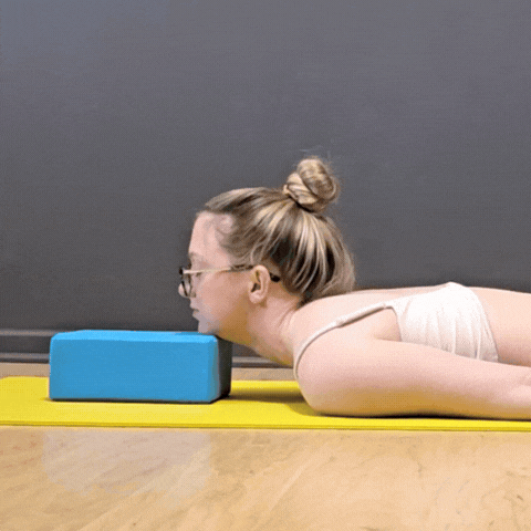 Keeping the front of your shoulders pressing into blocks or the floor, lift your chin off the floor, then with control let it lower back to rest on the floor. Repeat for 8-12 chin lifts
