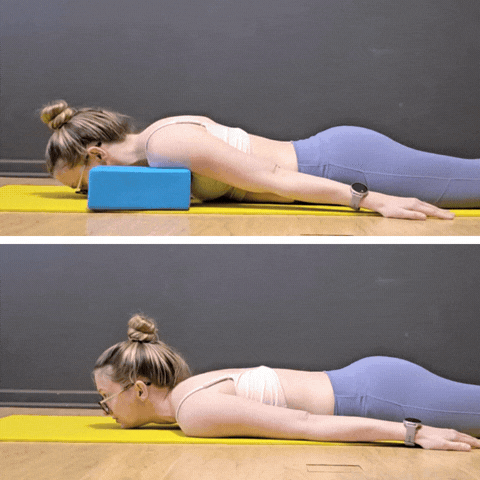 Make it harder: For folks with more neck flexibility, you can start with your chin on a block and do your chin lifts on a block (so long as you can keep shoulder contact with the floor!)