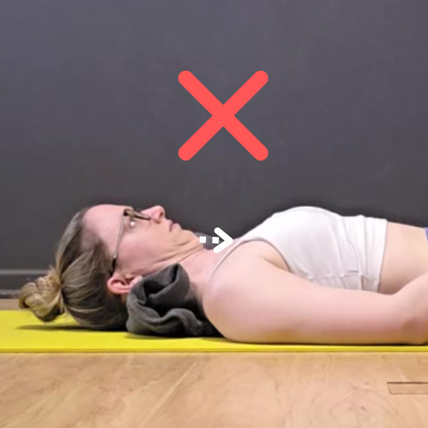 Start lying on your back on the floor, with a rolled up towel behind your neck, gaze up towards the ceiling. We want our neck to be in a “neutral” (slightly arched) position to start, with the towel filling in the gap between the back of our neck and the floor.