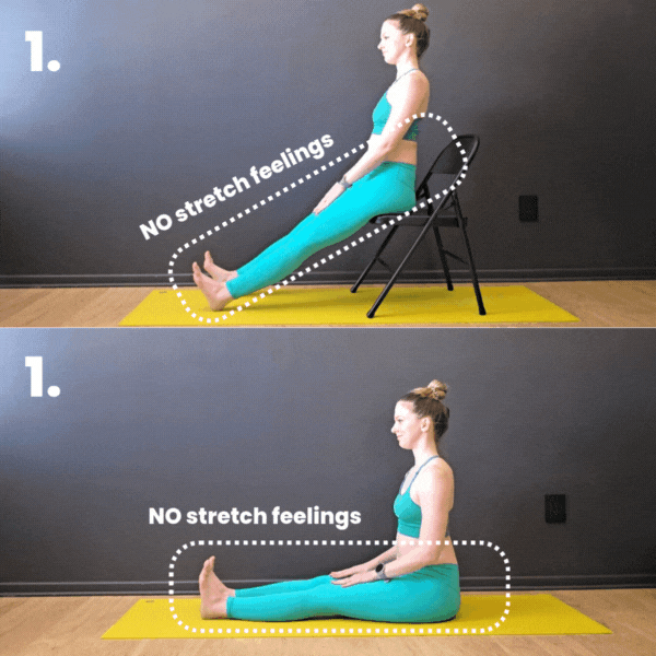 Start sitting upright with your back flat, legs extended out in front of you with feet comfortably flexed. This starting position should not feel like a stretch - so that means not over-flexing your feet (we don’t want to cause a calf stretch or feel any stretch underneath the knee), and possibly sitting on yoga blocks or a chair if you’re feeling a stretch in your hamstrings or back. This starting position should feel easy!
